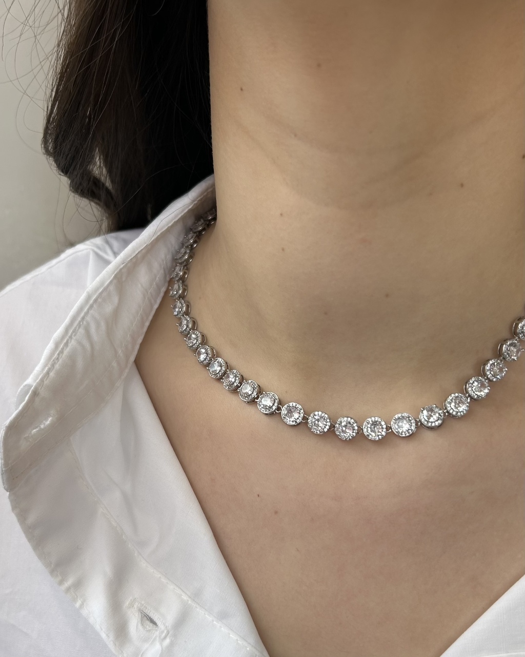 Conjunto de colar e brinco, banhado a ródio branco.